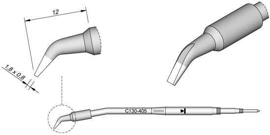 C130-419 tip is 4.8 mm wide, 1.5 mm thick and 12 mm long.